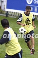 西班牙皇家馬德里足球隊(duì)二十六日下午在昆明冒雨訓(xùn)練,圖為勞爾在對(duì)抗訓(xùn)練中帶球過人。中新社記者:毛建軍