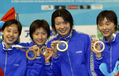 27日,中國(guó)游泳隊(duì)在巴塞羅那世界游泳錦標(biāo)賽,奪得了女子四乘一百米混合泳接力賽的冠軍,中國(guó)姑娘還以三分五十九秒八九的成績(jī)打破了世錦賽的賽會(huì)紀(jì)錄,并且如愿拿到了這枚份量最重的金牌。(圖左起)戰(zhàn)殊、羅雪娟、周雅菲和楊雨登上領(lǐng)獎(jiǎng)臺(tái)。