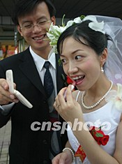 七月二十七日,北京市為抗SARS延誤婚期的五十一對新人舉行了隆重、熱烈的集體婚禮。中新社記者:史利