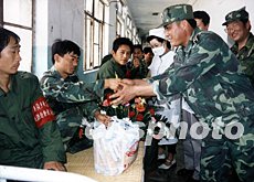 安徽省淮南軍分區(qū)指揮員來到醫(yī)院,向七月淮河抗洪中傷病住院的民兵贈(zèng)送鮮花和慰問品。今夏三次洪峰過后,洪水已于七下旬日漸回落。作者:詹濤