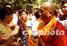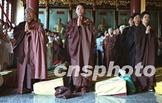 慶典儀式于上午十時(shí)在潭柘寺大雄寶殿外小廣場舉行。大雄寶殿上方“潭柘寺建寺一千六百九十六年暨祈禱世界和平國泰民安法會(huì)”紅色橫幅十分醒目。北京佛教協(xié)會(huì)、北京市文物局、北京市旅游局負(fù)責(zé)人以及數(shù)百名中外游客參加了慶典儀式。隨后,潭柘寺方丈常道法師在大雄寶殿內(nèi)主持法會(huì)。二十多位住寺僧侶及眾多善男信女在缽和木魚等敲打樂的伴奏下吟唱佛經(jīng)。常道法師向佛像敬香、頂禮膜拜,祈禱世界和平國泰民安。