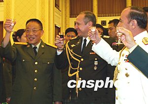 中央軍委副主席曹剛川向出席招待會(huì)的外國(guó)駐華武官敬酒。中新社記者:鄭萍萍