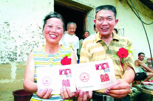 7月30日,曹學(xué)良、王代英領(lǐng)取了大紅的《結(jié)婚證》,新的生活開(kāi)始了!婚禮在幸福的包圍中進(jìn)行昨日凌晨4時(shí),心情激動(dòng)的王代英就醒了。她悄悄起身收拾房間打掃院落,在房門上貼上紅紅的“喜”字。早上6時(shí),前來(lái)幫忙的幾十位親戚朋友來(lái)到小院,各司其職,張羅著婚禮的各項(xiàng)事宜。