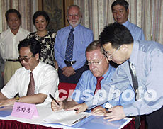 “二00三年全國鄉(xiāng)鎮(zhèn)企業(yè)東西合作經貿洽談暨產品展銷會日前在中國旅游標志“銅奔馬”的故鄉(xiāng)甘肅武威閉幕。貿洽會共簽約項目七百四十五個,總投資一百六十六點七億元人民幣,引進資金一百四十三點三億元。圖為歐盟中國協(xié)會秘書長畢加和、法中協(xié)會主席稚克·溫明登先生分別與甘肅省有關部門就相互合作事宜簽約。作者:楊曉波