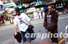 8月3日,外國(guó)游客打扮成“大猩猩”在香港時(shí)代廣場(chǎng)一帶消遣玩樂(lè),引來(lái)不少途人圍觀。中新社記者:洪少葵