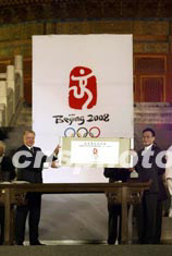 中共中央政治局常委、全國人大常委會委員長吳邦國和國際奧委會協(xié)調(diào)委員會主席維爾布魯根將這方以“中國印·舞動的北京”命名的會徽徽寶,飽蘸紅色印泥,在中國宣紙上鄭重蓋下了印記。從這一刻起,舞動的北京張開雙臂,以開放的姿態(tài)迎接四方友人,與世界共同起舞。