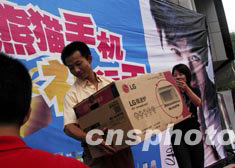 面對(duì)外國(guó)手機(jī)雄霸中國(guó)大城市的現(xiàn)狀,一些國(guó)產(chǎn)手機(jī)避開峰頭選擇在中小城市推銷。國(guó)產(chǎn)熊貓手機(jī)銷售商夏季在陜北延安市百貨大樓前搭起有獎(jiǎng)促銷臺(tái)。中新社記者:王麗南