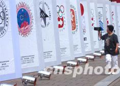 北京2008年奧運(yùn)會(huì)徽八月三日夜大白天下后,引發(fā)中國(guó)民眾的關(guān)注。一名市民用攝像機(jī)拍攝下歷屆奧運(yùn)會(huì)會(huì)徽的宣傳畫(huà)。中新社記者:賈國(guó)榮