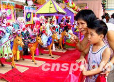 農(nóng)歷七月初七是廣州民間傳統(tǒng)節(jié)日“七姐誕”,廣州番禺區(qū)譚山村的村民在村中的藍(lán)球場上大擺展臺,熱鬧非凡,展臺上擺滿了一套套傳統(tǒng)故事的人物公仔維妙維肖,展現(xiàn)了嶺南民間文化的藝術(shù)特色。作者:廣東分社羅仰明