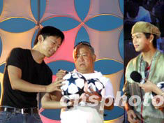 八月初,搜狐公司在北京朝陽公園舉辦“搜狐在線2.0,簡單上網(wǎng)新生活”大型游園會,眾多明星前來捧場。張朝陽和香港著名影星曾志偉(中)為網(wǎng)民簽名。中新社記者:張勤
