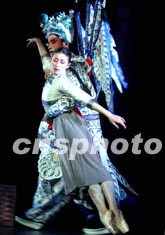 中國中央芭蕾舞團新版《大紅燈籠高高掛》夢幻舞中的女學生熱戀京劇武生趙子龍的夢幻雙人舞,音樂和編舞更具浪漫情結(jié)。中新社記者:賈國榮