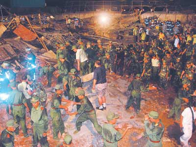 事故發(fā)生后,廈門一二○、公安、消防、武警等三百多人于第一時(shí)間前往施救,中共廈門市委書記鄭立中、市長(zhǎng)張昌平也迅速趕到現(xiàn)場(chǎng)指揮搶救。廈門警備區(qū)近一百名現(xiàn)役官兵及一百名預(yù)備役民兵也趕往現(xiàn)場(chǎng)參與救援。