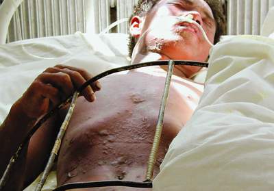 8月6日上午,解放軍307醫(yī)院黃韶卿教授、沈陽軍區(qū)醫(yī)研所所長(zhǎng)王繼群、解放軍321醫(yī)院燒傷科主任周長(zhǎng)軒、解放軍307醫(yī)院急救中心主任王漢斌博士等先后來到齊齊哈爾,對(duì)中毒人員進(jìn)行了進(jìn)一步確診。據(jù)203醫(yī)院院長(zhǎng)孫景海介紹,芥子氣中毒臨床癥狀為三期:休克期、感染期和骨髓抑制期,目前,31名中毒患者已度過休克期,醫(yī)院正全力以赴使處感染期的患者得到救治。