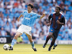 這是曼城備戰(zhàn)新賽季英超的最后一場比賽,同時也是曼徹斯特大球場的揭幕戰(zhàn),因此,主教練基岡格外重視。孫繼海首發(fā)出場擔任右后衛(wèi),他的身后是門將西曼。而他面對的是剛剛轉會巴塞羅那隊的小羅納爾多的進攻。第5分鐘,奧維馬斯帶球突破菲利普斯后獲得很好的機會,孫繼海上前封堵,逼得奧維馬斯傳球出界。雖然對手實力很強,但在主場作戰(zhàn)的曼城仍與對手展開對攻。孫繼海與菲利普斯這邊的進攻明顯要比左路活躍。第34分鐘曼城首先打破僵局,貝爾科維奇中路得球后轉身快速突破,雷茨格爾慌亂中將球誤傳給阿內爾卡,法國人門前右腳推射破門。上半場曼城一球領先巴塞羅那。
