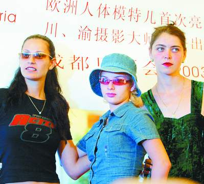 三名人體模特剛一露面,就被蓉城媒體記者和順勢抬起“大炮”開拍的攝影家們“閃”得頭昏眼花。模特們顯然很專業(yè),馬上擺出曲線畢露的Poss和職業(yè)的笑容。記者略數了一下,“長槍短炮”的數量竟然多過在場人數。