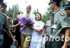 北京最后兩位非典患者八月十六日從地壇醫(yī)院康復(fù)出院,北方交通大學(xué)十九歲學(xué)生孫崢在護士長的陪伴下出席歡送儀式。中新社記者:賈國榮