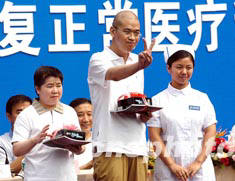 中國最后兩名非典病人孫錚(中)和盧志艷(左一),八月十六日上午于北京地壇醫(yī)院康復(fù)出院,并向醫(yī)護工作者告別。中新社記者:鄒憲