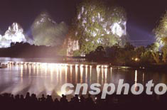 中新社陽(yáng)朔八月十七日電(記者王永志)素有“山水甲天下”的桂林陽(yáng)朔昨晚開(kāi)排山水實(shí)景演出《印象.劉三姐》。主辦者稱,以方圓二公里的漓江水域做舞臺(tái),以十二座山峰和廣袤天穹做背景,并有數(shù)百名漁民和專業(yè)演員參加演出,將是世界上最大的山水實(shí)景演出。