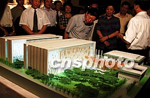 圖為全國人大副委員長蔣正華(右)十九日參觀由德國KSP建筑設計有限公司與華東建筑設計研究院聯(lián)合設計的方案,該方案是最后的三個推薦方案之一。中新社記者:王麗南