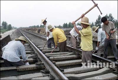 中新網(wǎng)8月20日電 今天,濟(jì)南鐵路分局泰安工務(wù)段職工在京滬線泰安段曲線半徑改造工程上施工,為第五次大提速做準(zhǔn)備。