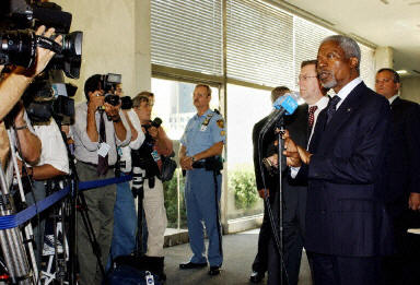 安南表示,聯(lián)合國(guó)在伊拉克的辦公大樓在星期二被炸,這對(duì)聯(lián)合國(guó)來說是可怕的一天,但聯(lián)合國(guó)不會(huì)被嚇倒。