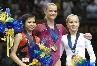在北京時間23日上午10點50分結束的世界體操錦標賽女子個人全能比賽中,中國小將張楠(左)以四個單項37.624分的總分獲得了一枚銅牌。俄羅斯著名選手霍爾金娜(中)蟬聯(lián)了金牌,美國運動員佩特森(右)奪得銀牌。