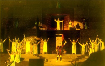 他透露,與傳統(tǒng)的悲傷結(jié)尾不同,此次演出為《阿依達(dá)》設(shè)計了一個富有東方情調(diào)的結(jié)尾,越到結(jié)束時氣氛越熱烈,燈光熄滅后金字塔上將點亮幾百個火把,成百上千的氣球和蝴蝶將飛向空中……