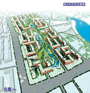 該方案將奧運村地塊劃分為18個城市街區(qū),從東南向西北,逐漸由“鬧”到“靜”。東南方向以公建為主;西北方向布置住宅、公寓。住宅樓設計成折形板樓,形成“類四合院”的效果。