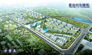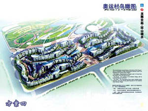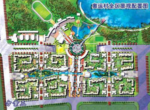 。牐犨@個設計方案把傳統(tǒng)的中國住宅規(guī)劃模式轉化為由奧運五環(huán)幻化而成的曲線,圓形升旗廣場象征“龍珠”。