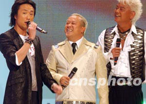 在二十三日晚紅(石+勘)香港體育館舉行的2003年度香港小姐競選決賽上,香港明星曾志偉、陳百祥、鄭中基擔任港姐競選大會司儀。中新社傳真 錢興強 攝