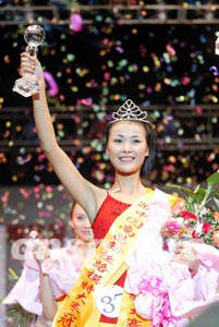 2003年中國(guó)南昌新絲路模特大賽二十三日晚在南昌市紅谷灘行政廣場(chǎng)舉行,六十名男女選手在T臺(tái)上展示青春靚麗風(fēng)采。來(lái)自當(dāng)?shù)氐氖艢q選手肖嬌獲得冠軍。中新社記者:毛建軍