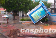 八月二十五日清晨,“科羅旺”臺風襲擊海南省?谑。海口市街道眾多燈箱式廣告牌被吹到在地。作者:蔣聚榮