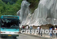 馳名中外的四川省九寨溝風(fēng)景旅游地今夏正在拓寬綠色環(huán)保觀光車的道路,路邊工作面被蒙上專用材料,一邊遮擋泥石,一邊培育綠草。修路宛如保護(hù)環(huán)境的行為藝術(shù)。中新社記者:賈國(guó)榮