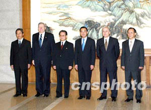 在會(huì)談開始以前,參加北京六方會(huì)談的各方代表團(tuán)團(tuán)長(zhǎng)在釣魚臺(tái)國(guó)賓館芳菲苑大廳前集體亮相與各路媒體記者見面,他們的順序從左到右依次是日本外務(wù)省亞大局局長(zhǎng)藪中三十二、美國(guó)助理國(guó)務(wù)卿凱利、朝鮮外務(wù)省副相金永日、中國(guó)外交部副部長(zhǎng)王毅、俄羅斯副外長(zhǎng)洛休科夫和韓國(guó)外交通商部次官補(bǔ)(長(zhǎng)官助理)李秀赫。