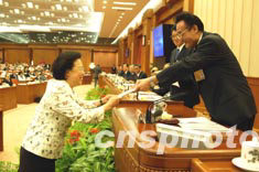 全國(guó)人大常委會(huì)委員長(zhǎng)吳邦國(guó)二十七日在第十屆全國(guó)人大常委會(huì)第四次會(huì)議上,向全國(guó)人大常委會(huì)香港特別行政區(qū)基本法委員會(huì)組成人員頒發(fā)任命書(shū)。圖為吳邦國(guó)委員長(zhǎng)向譚惠珠委員頒發(fā)任命書(shū)。中新社記者:毛建軍