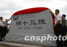 中新社北京八月二十八日電(記者吳慶才)今天,北京有關(guān)部門(mén)為上月被列入世界文化遺產(chǎn)名錄的明十三陵正式“樹(shù)碑立傳”,一塊坐落于明十三陵門(mén)戶(hù)——大紅門(mén)前的世界文化遺產(chǎn)標(biāo)志牌正式落成,并將成為十三陵特區(qū)新的標(biāo)志性景觀。
