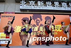 西門子移動電話公司三十日為中國女子足球隊9月出征世界杯比賽舉行“萬人簽名為中國女足加油”活動。中國男足隊員祁宏為“西門子小姐”邀簽名留念。中新社記者:趙振清