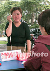 8月31日,鄭州市一位因經(jīng)濟(jì)困難而沒有委托訴訟代理人的女性在接受免費(fèi)的法律服務(wù)。當(dāng)日鄭州市許多法律援助中心走上街頭,宣傳將于9月1日實(shí)施的《法律援助條例》,并為求助的人員提供免費(fèi)的法律幫助。作者:慎重