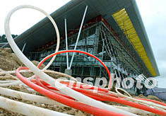 正在四川省松潘縣川主寺修建安裝的九寨黃龍旅游機(jī)場(chǎng)候機(jī)樓,為中國(guó)高原的現(xiàn)代化航空港,將于九月二十八日通航使用。它可停靠五架飛機(jī),滿足年六十萬(wàn)人次的旅客流量。中新社記者:賈國(guó)榮