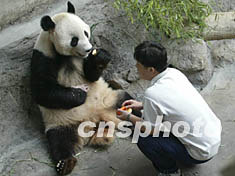 北京動物園八歲大熊貓“妞妞”8月24日生下一只幼崽后,經(jīng)過十天母子平安。與“妞妞”朝夕相處的飼養(yǎng)員成功地實(shí)行“無間隔”近距離護(hù)理產(chǎn)后大熊貓,這在北京動物園是首次。中新社記者:任晨鳴