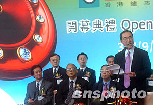 亞洲最大型的鐘表展“香港鐘表展2003”,九月三日在香港會(huì)展中心揭幕,來(lái)自世界各國(guó)及內(nèi)地、香港的七百多家參展商參展。圖為香港財(cái)政司司長(zhǎng)唐英年在開(kāi)幕式上致辭。中新社記者:錢(qián)興強(qiáng)