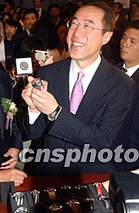 亞洲最大型的鐘表展“香港鐘表展2003”,九月三日在香港會(huì)展中心揭幕,香港財(cái)政司司長(zhǎng)唐英年在展會(huì)上參觀。中新社記者:錢(qián)興強(qiáng)