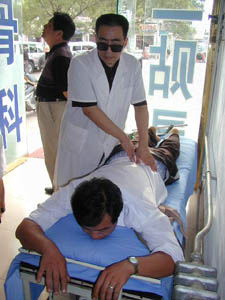 山東省德州市盲人馬利群在給病人治療腰椎間盤突出,老馬的夫人是一個(gè)身體健康的大專生,他倆有一個(gè)活潑可愛、身體健康的5歲孩子。華夏時(shí)報(bào)圖