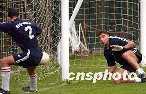 九月九日下午,敘利亞隊U23隊(國奧隊)在昆明紅塔足球訓(xùn)練基地參加賽前最后一次訓(xùn)練。圖為敘利亞隊守門員準備撲救門前球。中新社記者:張煒