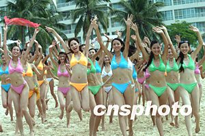 經(jīng)過幾天在海南三亞的賽前培訓,九月十日,參加2003年新絲路中國模特大賽的五十一名佳麗到海灘上放松心情,舒緩大賽前的緊張氣氛。中新社記者:盛佳鵬