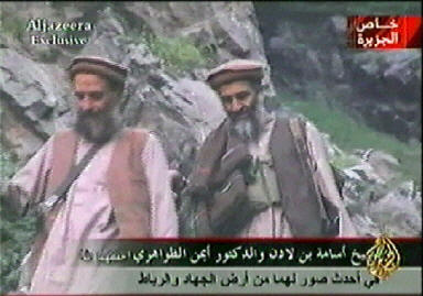 在9·11恐怖襲擊兩周年紀念日到來之際,卡塔尓半島電視臺9月10日晚播放了“基地”組織的最新錄像和錄音帶!盎亍苯M織一號人物本·拉登和二號人物扎瓦赫里同時出現(xiàn)在錄像帶中。