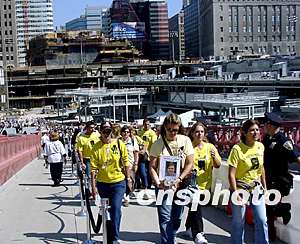 八點半,紐約市長布隆博格宣布紀念儀式開始,隨后兩百名來自罹難者家庭的孩子輪流誦讀二千七百九十二名世貿罹難者名單,其中包括三十名警員和三百多名消防員。這期間像去年一樣,在兩座大樓被撞和倒塌的四個悲劇性時刻,全城鳴鐘、默哀。參加紀念儀式的罹難者家屬都聚集在主席臺前,他們手捧鮮花和親人的照片,當聽到自己親人的名字時,他們會高高舉起照片示意,然后前往廢墟最底層給親人獻花。整個紀念儀式持續(xù)近四個小時。今年紐約紀念活動的主題是“重建”,除了哀傷還洋溢著團結與希望。