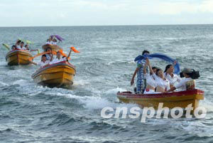 九月十三日晚,2003年新絲路中國模特大賽在海南三亞的天涯海角的海灘舞臺上進(jìn)行最后的排練,這次決賽的參賽模特將從海上登陸演出舞臺。中新社記者:盛佳鵬