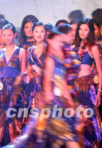 九月十三日晚,在2003年新絲路中國模特大賽海南三亞天涯海角的演出排練現(xiàn)場,身著絢麗晚裝出場的模特成為舞臺上流動的風(fēng)景。中新社記者:盛佳鵬
