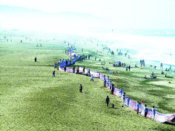 據(jù)星島日?qǐng)?bào)美國版報(bào)道,九月七日當(dāng)天,長(zhǎng)達(dá)五英里的美國旗旗海,在紐約自由神像島上由三千名義工舉起,藉以紀(jì)念“九一一”事件中的死難者。這些印上自由神像及死難者名字的旗幟,在紐約飄揚(yáng)過后,昨日再于舊金山市海灘上展現(xiàn)。